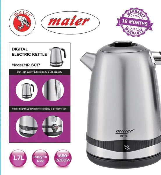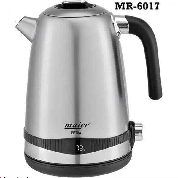 کتری برقی مایر مدل MR-6017 یک دستگاه کتری برقی با عملکرد بالا و ویژگیهای مدرن است که از کشور آلمان وارد بازار شده است. این کتری دارای بدنهای از جنس استیل ضد زنگ با رنگ استیل و دستهی مشکی زیبا است. توان مصرفی آن 2200 وات میباشد که امکان زودتر جوشاندن آب را فراهم میکند. گنجایش داخلی این کتری 1.7 لیتر است، که برای مصارف خانگی و حتی استفاده در محیطهای کاری کافی است.