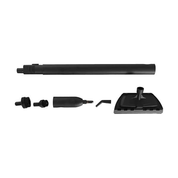 شیلنگ اضافی, تفنگ بخار, پنجره فشار, پارچه پاک کن, کاور, برس های کوچک و بزرگ گردان, سری مخصوص تمیز کردن کف با پارچه, دفترچه راهنما وزن